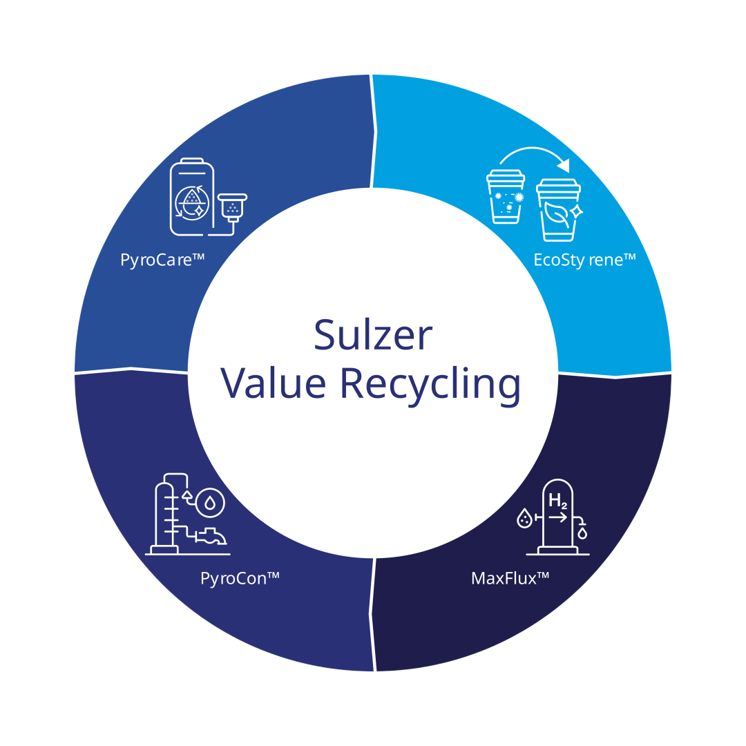 Sulzer Química Basándose en décadas de profunda acumulación en los campos de separación, purificación y mejora de la hidrogenación, se lanzó oficialmente Value Recycling cartera de tecnología que cubre PyroCon™ , PyroCare™ , MaxFlux™ , EcoEstireno™ Las cuatro tecnologías principales abordan directamente los puntos débiles en cada eslabón del reciclaje químico y ayudan a los clientes a transformar materias primas plásticas de desecho complejas, cambiantes y de alto riesgo en activos industriales rentables, operables y escalables.